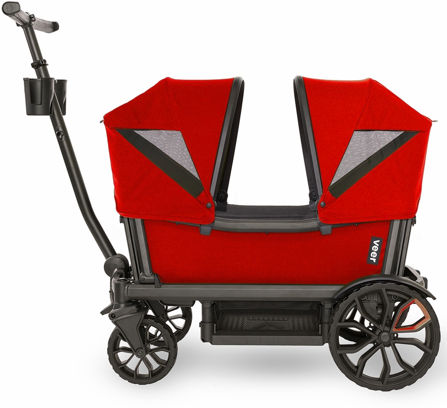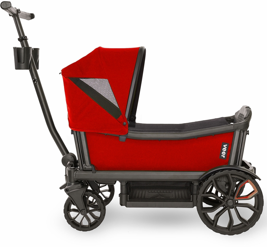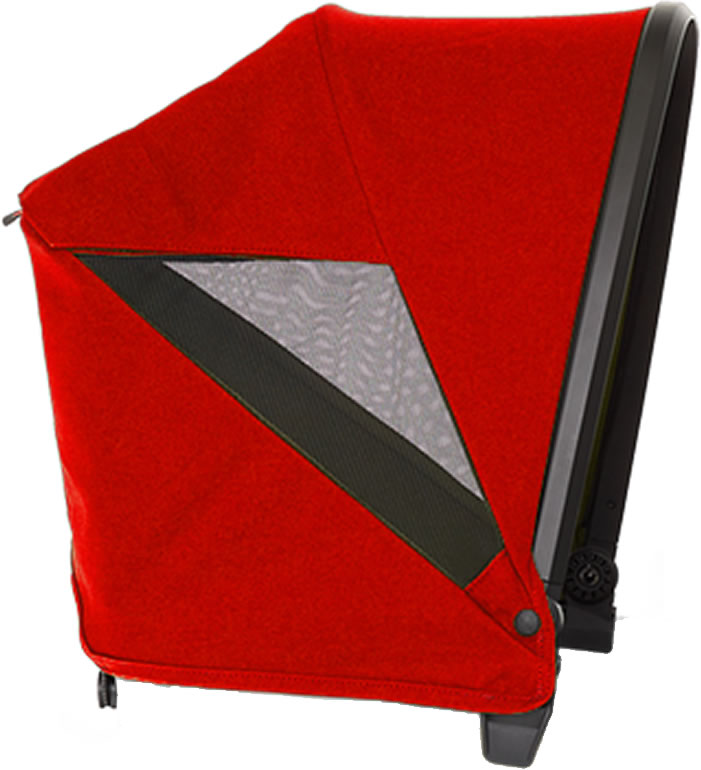 Pop goes the color with Veer's Pele Red Retractable Canopy. It coordinates well with Veer's original Heather Gray and all Veer accessories. Designed just like our original Retractable Canopy, it quickly and intuitively clips onto Cruiser?s frame and easily extends up and down. Like all Cruiser sidewalls and canopies, Pele Red is easy to keep clean. Hose wash or, for tougher stains, use a bit of mild dish soap and a soft brush or cloth to clean. One or two can be attached, above either seat. A peak-a-boo window allows you to see your precious cargo and discreet, and hidden magnets hold the window in the up position. Canopy works perfectly with Napper to create the perfect rest stop for young ones, or with Bug Shield to add insect protection.