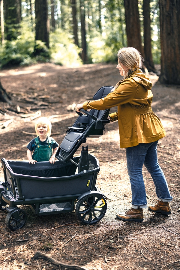 The revolutionary Switchback Seat is designed for any Veer frame so you can stroll, jog, bike or chill with one click from birth on. Easy clean, cushy softgoods, bump absorbing dampers and on-demand shade make for the most comfortable ride.