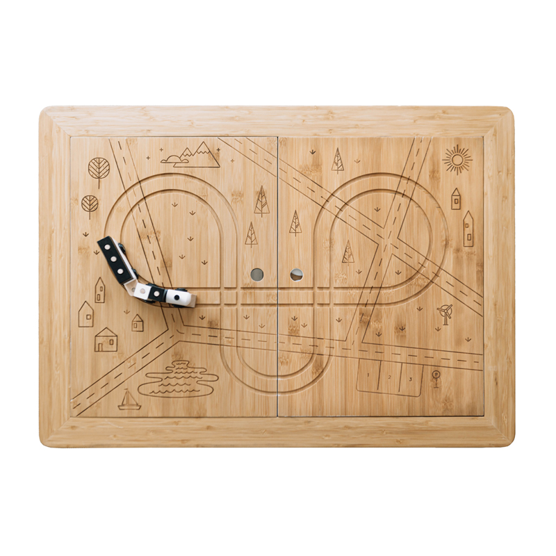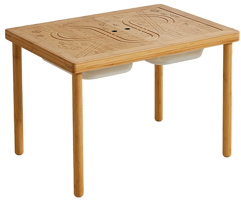 Put it all in the table with our Land, Sand and Water Table. 3 removable, collapsible plastic bins hold everything from sand, water, beans, rice, or whatever sensory fun you can imagine. Comes with two reversible covers; one side is a train track (fits most standard trains), and the other side is a chalkboard. Made of beautiful, sustainable bamboo, this table offers many ways to play. Simple adult assembly. Chalk and trains not included.