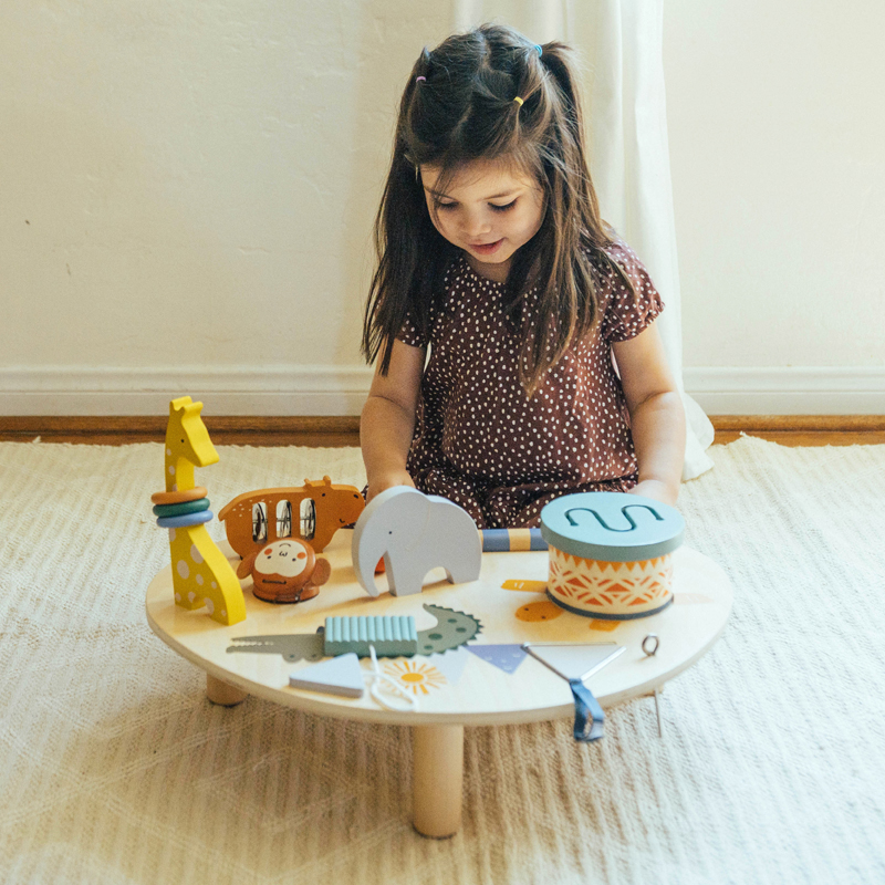 Get your little musician composing early with our Mini Music Maker. Our pint sized orchestra can be played on the floor or at the table, and includes giraffe rattle, hippo tambourine, snake whistle, elephant bead shaker, alligator ribbed xylophone, turtle drum, monkey castinet, and mountain triangle. Let’s make some music!