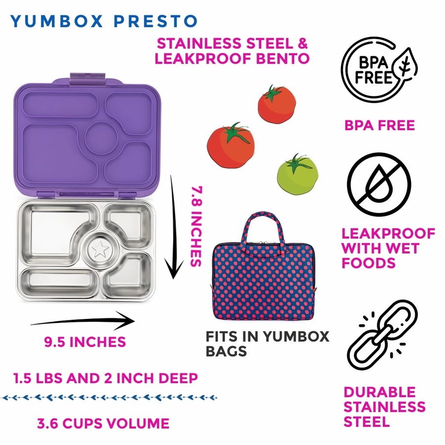 • High Quality & Durable: Yumbox Presto is made using all food-safe materials, BPA-free and phthalates-free. Yumbox is compact & lightweight.