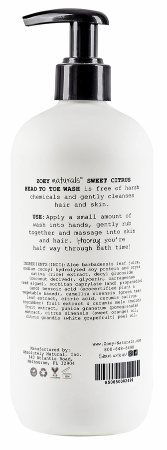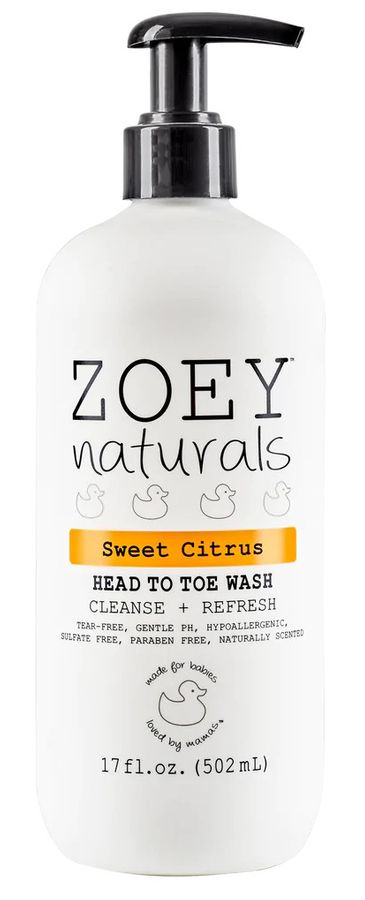 Our Sweet Citrus Head to Toe Wash is free of harsh chemicals and gently cleanses skin and hair. It's naturally gentle, tear free and has a gentle pH. Naturally scented with notes of sweet citrus. Zoey Naturals is formulated for babies and loved by mamas all around the world!